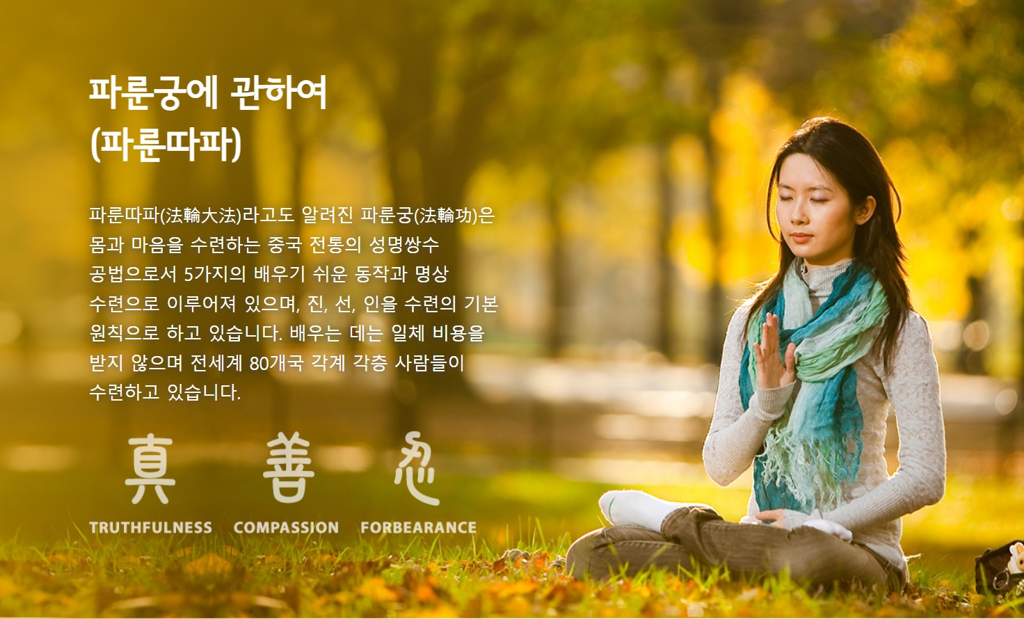 파룬궁(法輪功)은 파룬따파(法輪大法)라고도 부른다. 중국 전통 수련법으로 5가지의 배우기 쉬운 동작과 명상수련으로 이루어져 있다. 파룬궁은 불가(佛家) 수련대법으로 우주 최고특성 ‘진선인(眞善忍)’을 근본지도로 삼으며, 우주의 연화(演化) 원리에 따라 수련한다. 파룬궁은 1992. 5. 13. 중국 장춘에서 리훙쯔(李洪志) 선생에 의해 처음 전해져 7년 만에 수련자 수가 7천만 명에서 1억 명에 이를 정도로 선풍적인 인기를 끌었다.