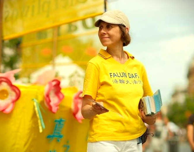 모니카가 파룬궁 진상 활동 중 자료를 나눠주는 모습